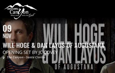 OCTOBER 6, 2017 - Exciting news!! So happy to announce my first "Opening Act" slot for a major headliner on Nov 9th!! The show was originally slated for The Canyon at Santa Clarita, but has since changed to The Canyon at Agoura Hills due to the new venue not yet being ready to open. I will be opening for Grammy Nominee Will Hoge. You probably recognize his "Strong" song from the popular Chevy Truck commercial. He also wrote "Even If It Breaks Your Heart" for the Eli Young Band, who took it to #1 on the country charts! Rolling Stone has compared him to Bob Seger and John Mellencamp! In addition, Dan Layus, former frontman of Augustana ("Boston"), will be on stage! Check out both of these fine songwriters at www.willhoge.com and www.danlayus.com.
